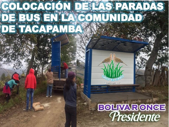 El gobierno autónomo descentralizado parroquial de El Cabo, cumpliendo con su plan anual de actividades coloca las paradas de buses en las comunidades de Tacapamba y Bellavista. En días posteriores se colocara en las otras comunidades